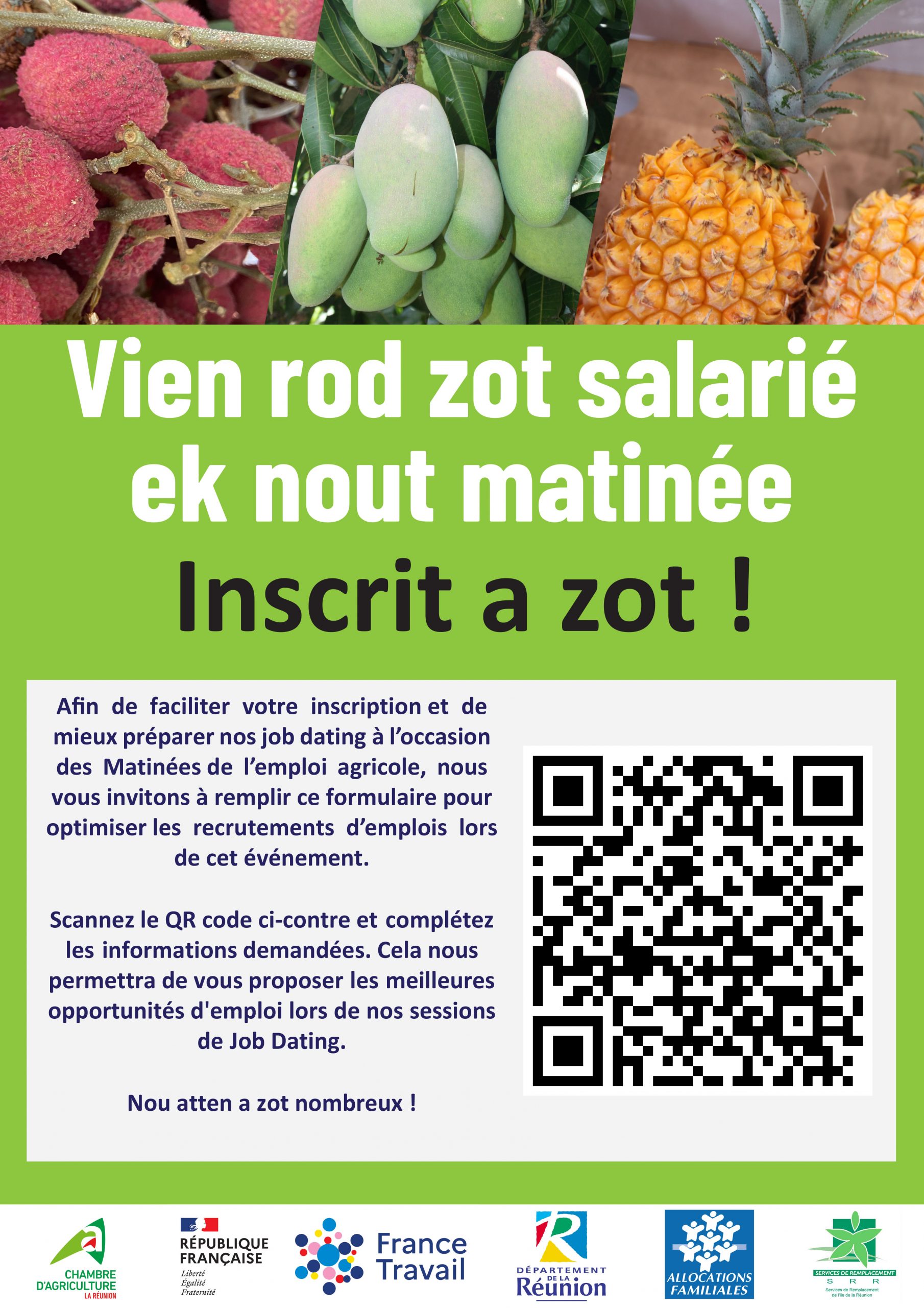 Dans le cadre de la matinée de l’emploi, nous vous invitons à remplir le formulaire ci-joint afin de soumettre votre demande. Vous pouvez également nous contacter par mail (eea@reunion.chambagri.fr) ou par téléphone 0262942594.