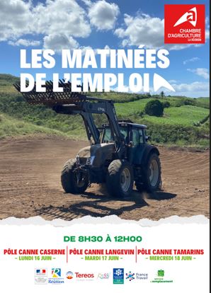 La Chambre d’Agriculture invite les exploitants agricoles et les demandeurs d’emploi intéressés par le monde agricole aux matinées de l’emploi, organisées en partenariat avec Tereos, la DAAF, le Département, la CGSS, la CAF et le service de remplacement, les :